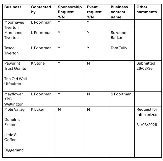 List of businesses / grant contacts made in the local area - for event planning, sponsorship etc.